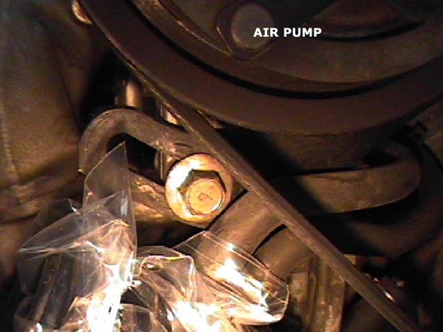 Here's the belt tension adjusting bolt for the air pump. The third and last bolt is just to the right of this pic - it's kinda far back in there. |