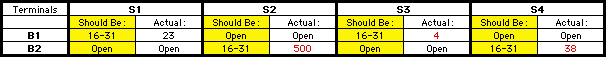 Removing the elbow gives good access to the MOP wiring harness for testing with an ohm meter. My (failed) results for the first test from the troubleshooting inspection are below. Note the readings that are out of spec are in red. |